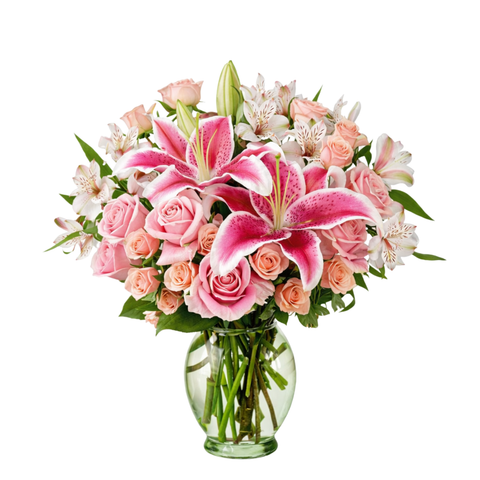 Show someone that she’s in your heart forevermore with this gorgeous floral arrangement of peach and pink roses, Stargazer lilies and mixed spring flowers.