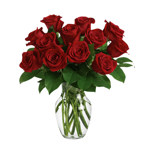 • A dozen red roses arrive perfectly arranged with Baby's Breath in a clear glass vase.