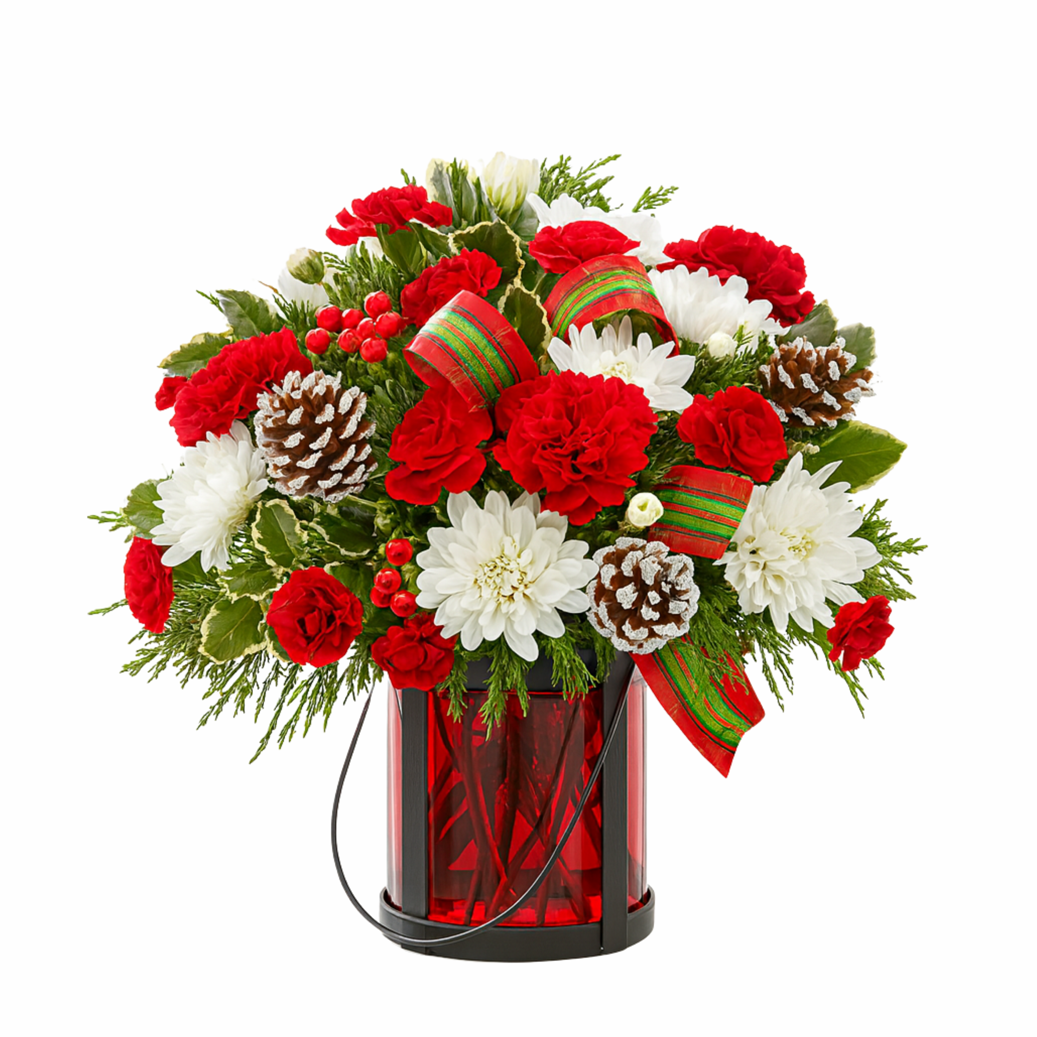 Red carnations are a wonderful surprise any time of year. Make an impression with our spectacular arrangement of red carnations and white daisies assorted with greens, designed in a stylish glass vase.