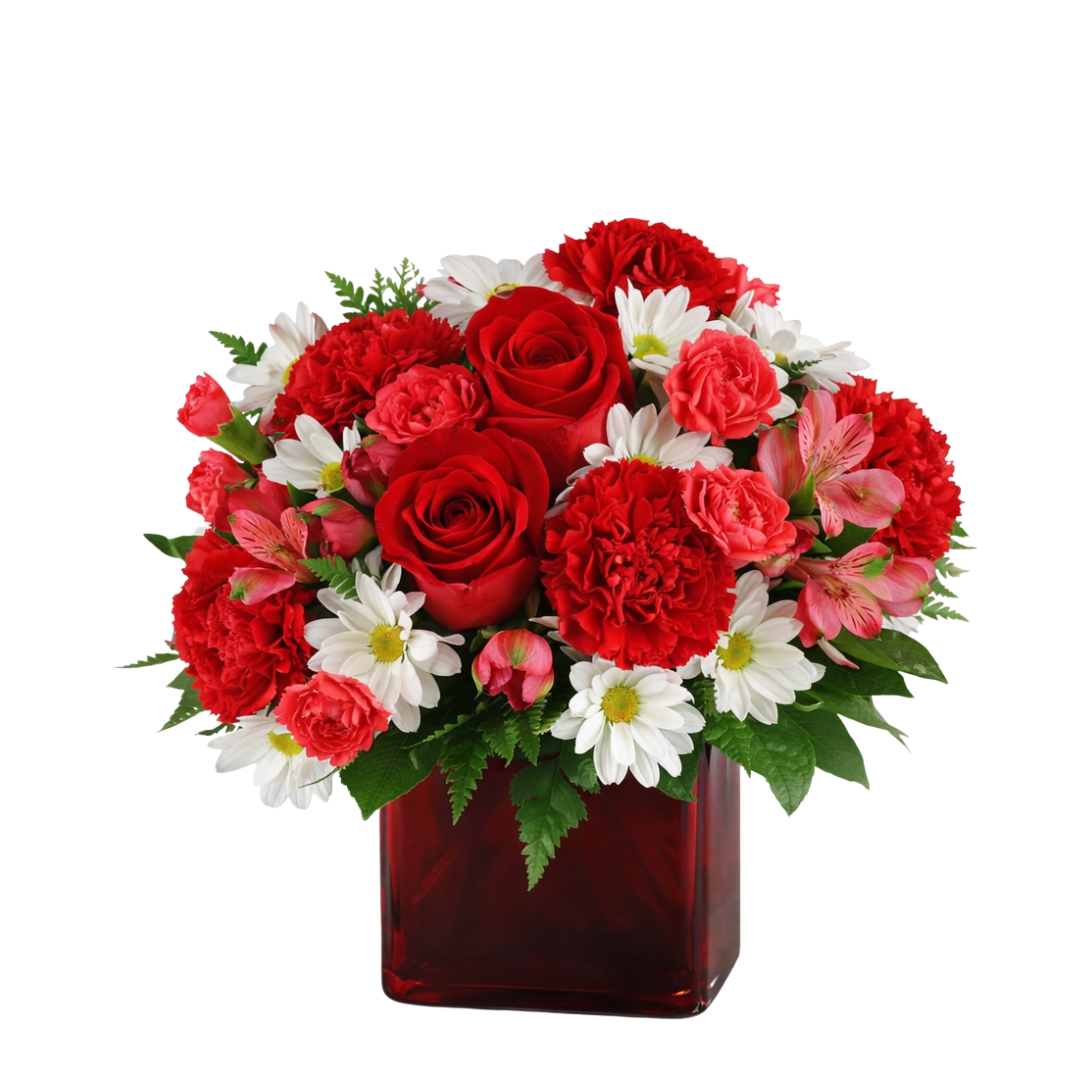 Need a little help from Cupid? Send our Cupids Crush arrangement to show them how much you care! A red cube vase showcases carnations, alstro, daisies and more in shades of red, pink and white!