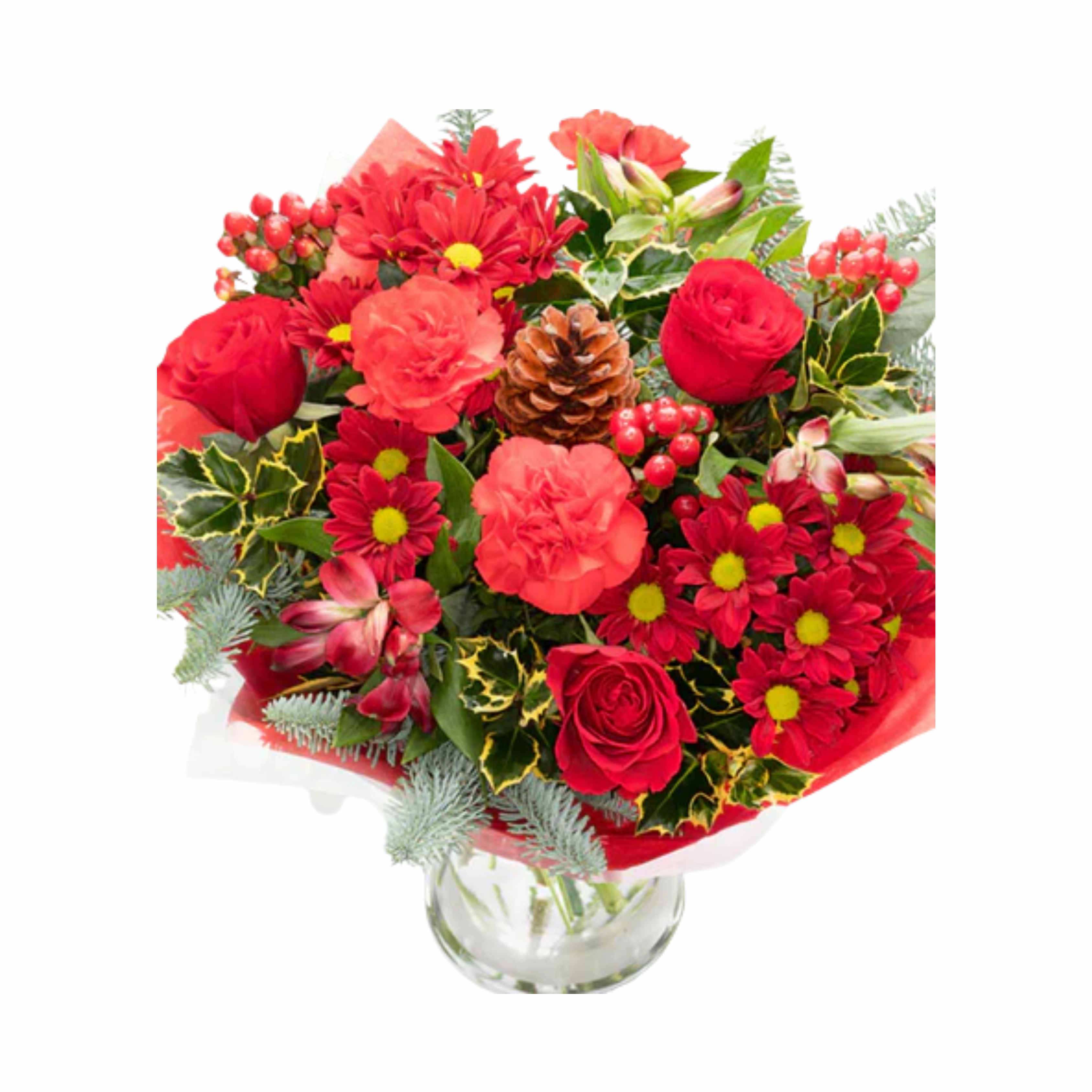A fantastic Christmas bouquet of sixteen stems in a kaleidoscope of seasonal colors; finished with a lavish cello wrap and presented in an adorable red festive gift bag.
