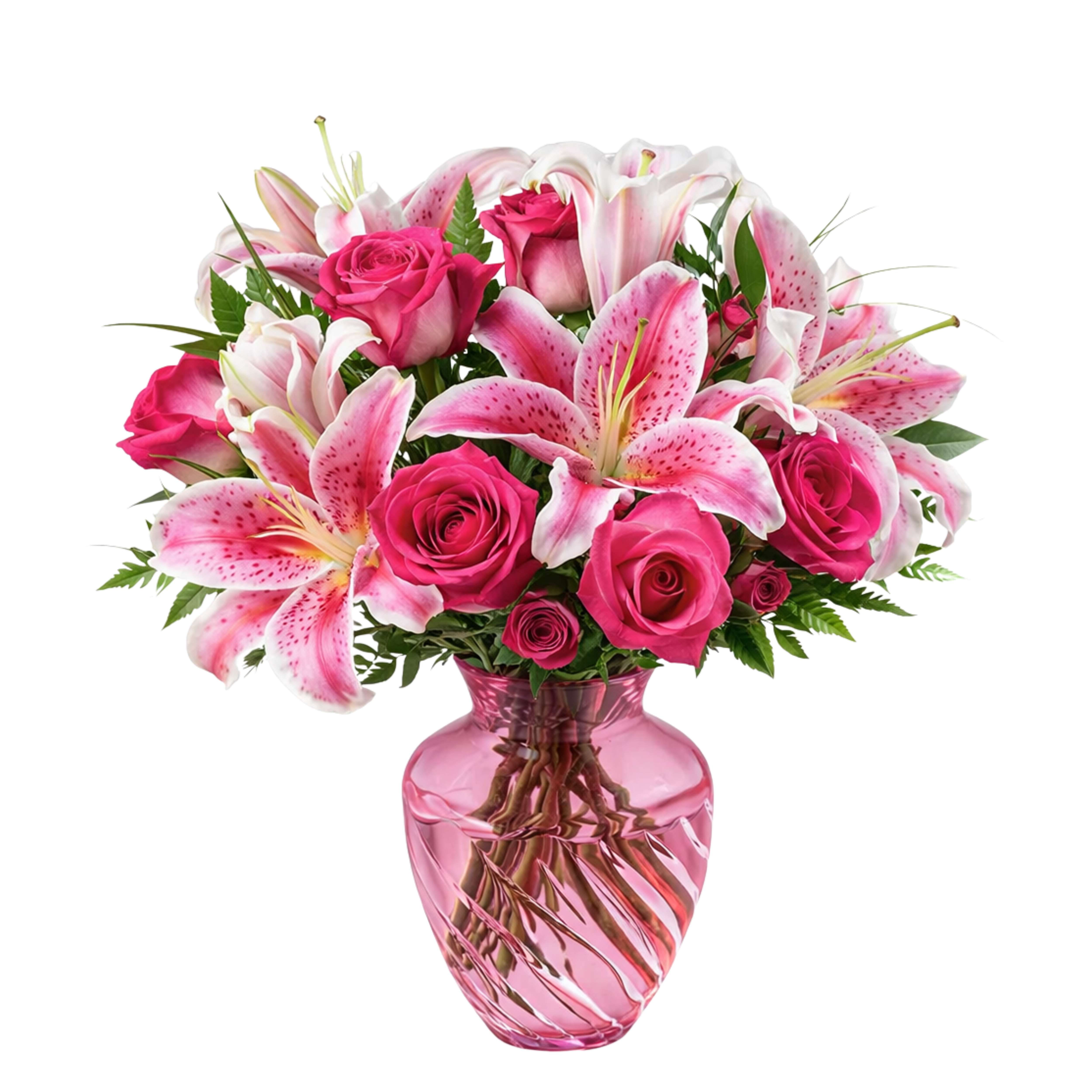 Tell her how much you care. Send her this elegant bouquet of hot pink roses and Stargazer lilies. This fragrant bouquet is beautifully presented in a lovely pink cut glass vase with clear diagonal striping. A beautiful gift for a beautiful lady.