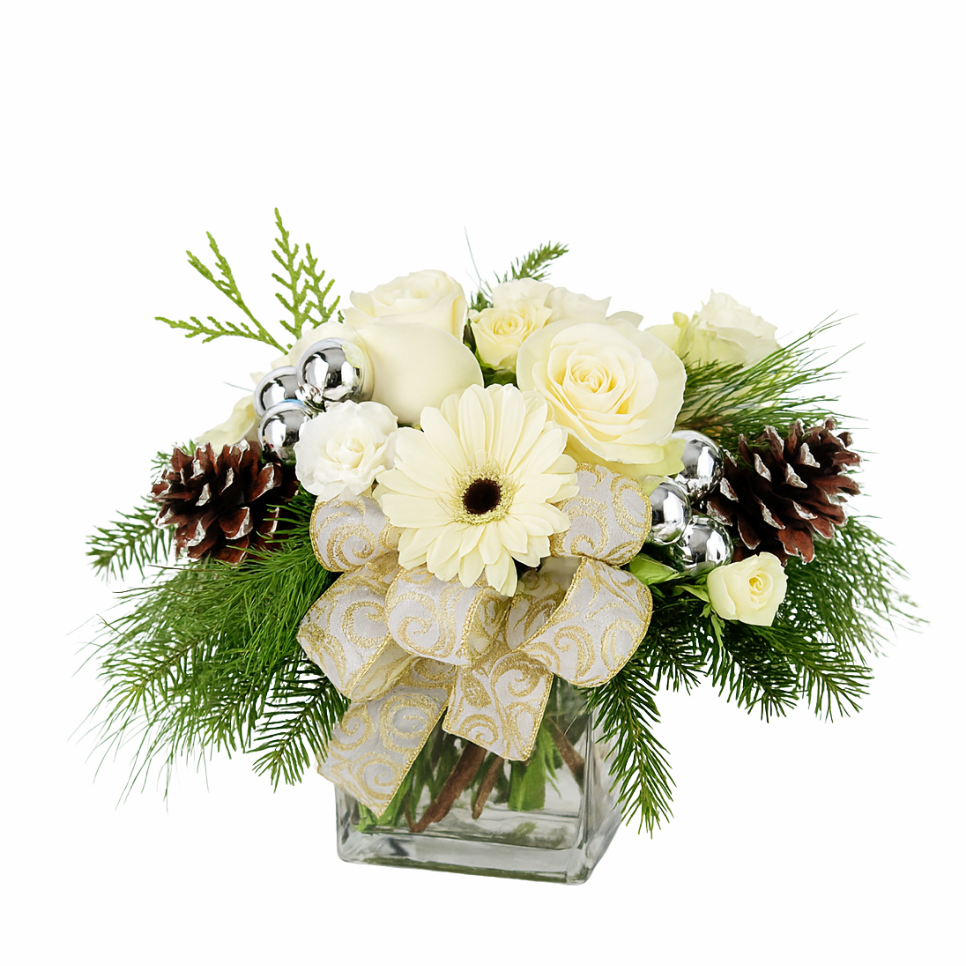This Christmas give a beautiful gift of white Gerbera daisies arranged with white mini carnations, frosted pine cones, cream roses, silver ornamental balls and matching bow. Perfection!